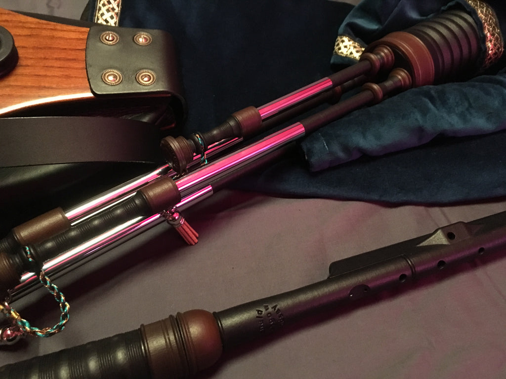 Bag and reeds : All pipe sets are supplied with Pipe Dreams' "Eezedrone" reeds, a cane chanter reed, and a canmore hybrid bag. Main stock and blowpipe stock do not need to be "tied in" in the traditional fashion, being instead equipped with a robust and easy to use screw-threaded clamping system (see pictures).